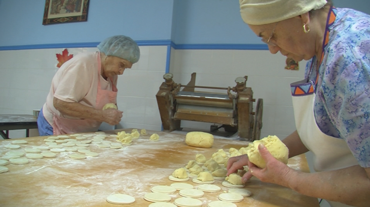 Two older white women are kneading dumplings. They are both wearing aprons and standing over a table that is covered with flour, dough, and finished dumplings.