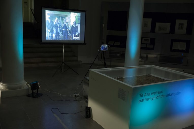 Te Ara Wairua, in Māori, means “pathways of spiritual or intangible energy.” Our project focuses on a Kakahu, a cloak of finely woven flax, wool, and dog hair, now held in University College London’s (UCL) Ethnography Collection. With backgrounds in designing virtual environments and a longstanding practice of connecting to Māori cultural treasures (taonga) through light and sound, Kura and Stuart’s intention was to “bring the UCL cloak into the light” and to bathe it with energy from Aotearoa, New Zealand. Working closely with the Taranaki-based Te Matahiapo Research Organization, they wanted to connect the cloak to a living Māori community. Throughout our project the term wairua, meaning “spiritual energy,” has been used as both an analogous and an encompassing term to describe the digital. Just as digital communication media largely exists as wireless waves of information, transmitted all around us, so too are taongaunderstood to create energetic networks of connectivity across space and time. The connection of this cloak, through broadband and cellular activity, to people both in London and New Zealand was therefore not framed as something new, but as a continuation of the kind of work that taonga are supposed to do: to connect people, activate networks of knowledge and sociality, and maintain those links.