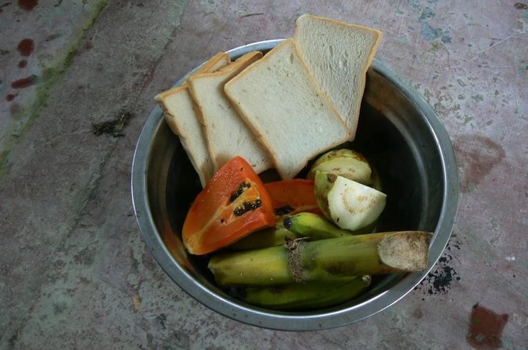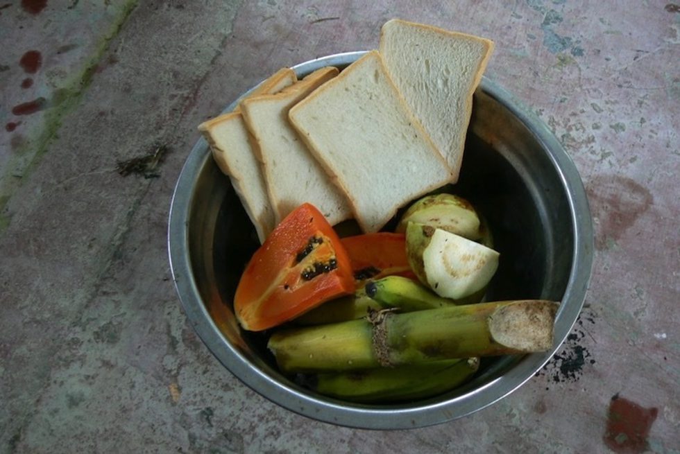 Is it a sad joke that the contents of the bowl pictured above are what semiwild orangutans eat, knowing that orangutans ideally eat an assortment of over two hundred plants (Galdikas 1988)? Similar to twentieth-century industrial workers, these orangutans are compelled to subsist on white bread. It was the fruiting season at the time I took this photo, so fresh bananas, guavas, sugarcane, and papaya are in the mix. All of these are regional cultivars, some introduced through transpacific trade (guava, papaya) and others domesticated in Southeast Asia (sugarcane, bananas). In American zoos, an orangutan diet consists primarily of animal feed like Purina Monkey Chow or ZuPreem Primate Diet Dry or Canned, which includes soy, corn, wheat, and animal fat (see Barbier 1985). Rehabilitant orangutans’ food is neither wild nor completely produced by the agricultural industry, as it is for zoo captives. Mirroring their status as semiwild, the food they earn is semicultivated.