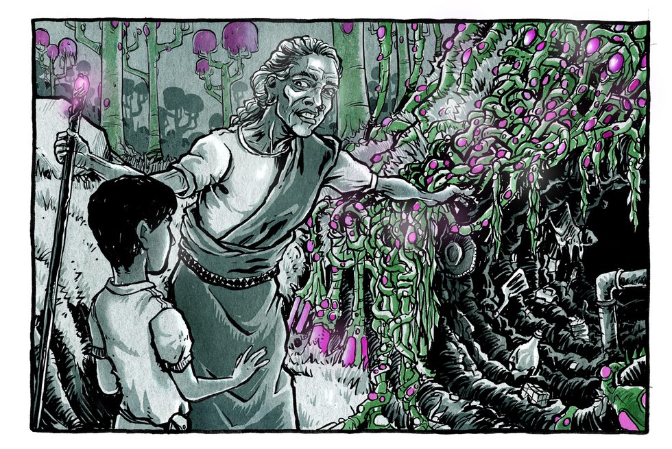 Ahead was a hummock of earth, covered in a tangle of creepers. Pacchi pushed them gently to one side, exposing a small passage into the soil. Her grandson followed nervously behind her as they made their way below ground. An acrid smell hung in the air. As Pacchi held out her luminescent staff, Suruli could make out strange shapes jutting from the sides of the passage. All around them was a chaos of matter, crazy stacks of broken and abandoned things: bunched-up wires and tubing, folds of woven fabric, plates of material with jagged edges, translucent slivers that crinkled at the brush of his fingers.