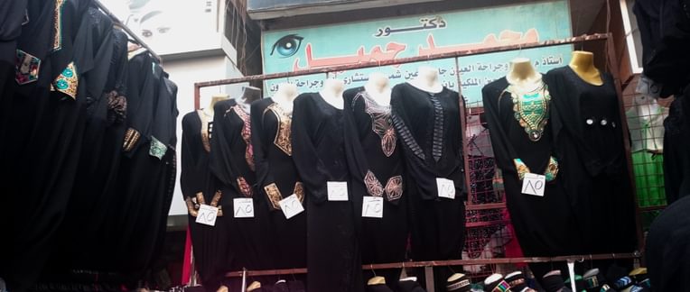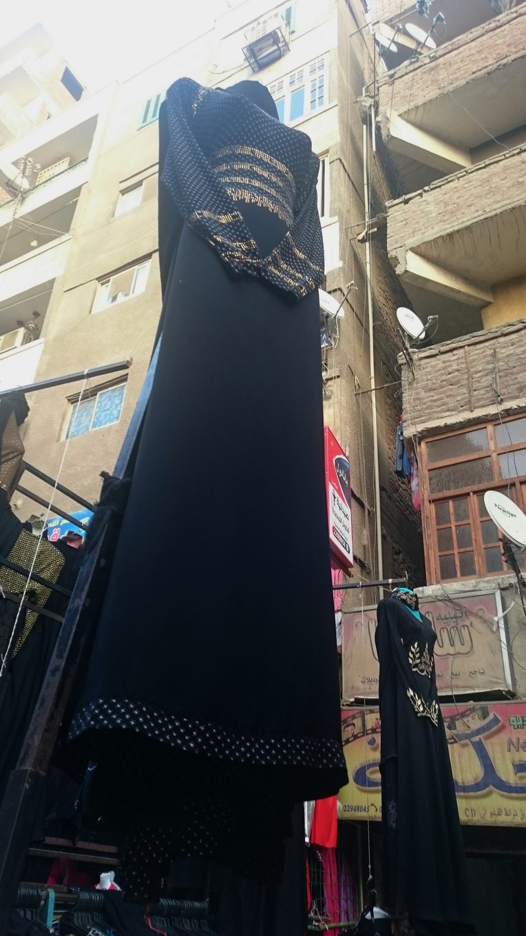 Excited for more conversations about abayas, I rushed after my interview with Nahla to the other end of the city, chaperoned and guided by Hend. A confident cheerful woman with a high-pitched voice, Hend was a forty-year-old housekeeping staff member in a nongovernmental organization (NGO) where I volunteered for years. On her way to and from the NGO, Hend always wore a black abaya, which encouraged me to ask her for a brief explanation of her choice to wear abayas. Hend was very welcoming, taking me to her neighborhood while showing me around a lively working-class clothing marketplace where I took the photographs featured in this essay.