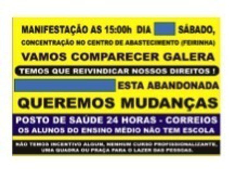 After a month of daily-news broadcasts about the protests, I came across the Facebook poster below circulating among my informants that invited everyone from the village to participate in a political rally. The poster says: “Demonstration at 3 pm, day [removed], Saturday, meeting place near the supply center (feirinha). Let’s show up, everyone, we must fight for our rights! [Baldoíno] is abandoned. We want changes [such as] 24-hour hospital facility, mail office, high school students do not have a school. We have no incentives, no professionalizing training programs, a sports field, or a square for leisure.”
