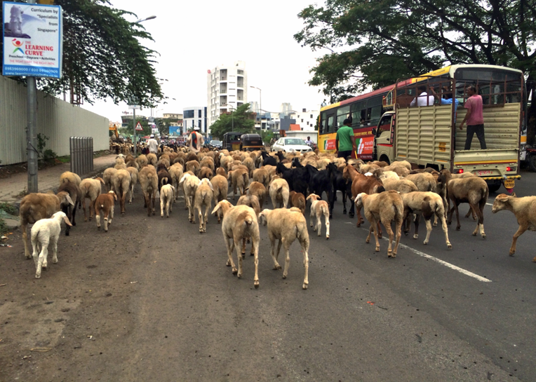Laura Murray: This photo was taken in early June 2016, a couple days after I arrived in Pune for my second round of preliminary fieldwork. The city was on the cusp of monsoon, so Maharashtra’s semi-nomadic herders (dhangars) were on the move. The migratory routes of this particular group cut through the heart of the city and, for a few short minutes, our paths converged: me, in search of lunch and them, homeward bound. I think the photo embodies a sense of movement, encounter, and connection that is telling of the kinds of human-animal relations in which I am interested.
