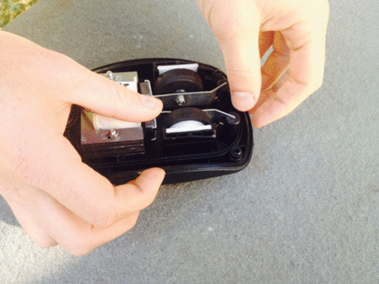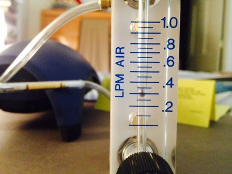 This aquarium pump, which gets repurposed as a vacuum, pulls air through a flow meter to regulate how much air passes through a tube that changes color when it contacts formaldehyde. After thirty minutes of pulling air, indoor formaldehyde levels can be read like a thermometer.