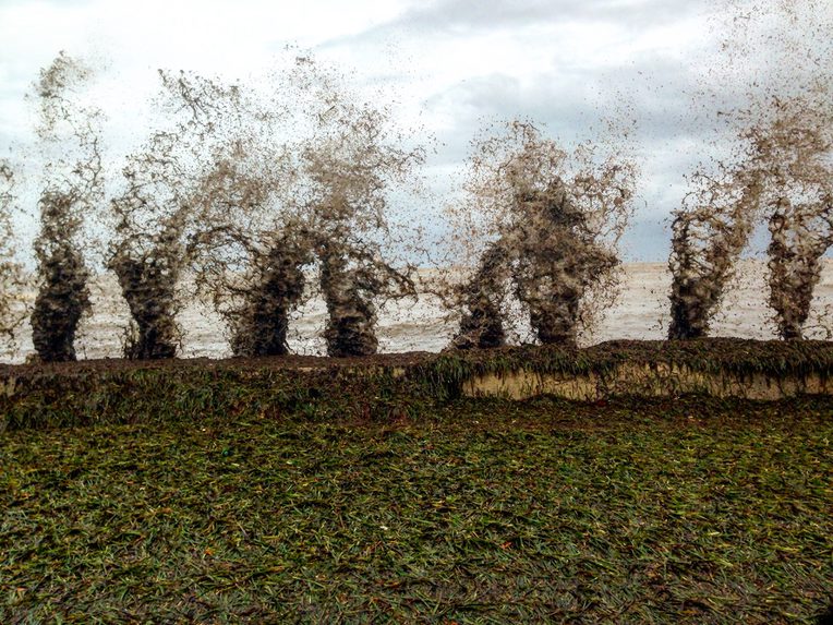 The devastating hurricanes of 2017 tore through these imagined borderwaters. Dominicans watched as Puerto Rico, Turks and Caicos, and the Bahamas were pounded by wind, waves, and rain, bracing for the impact of a weather system headed their way. The boundary between land and sea, reinforced in Monte Cristi by the seawall pictured here, did little to stop the violent swells coming into the bay. Lobster, eels, fish, and mountains of sea grass were sloshed to land by mud-heavy swells, reminders that aqueous territories have their own rules of engagement.