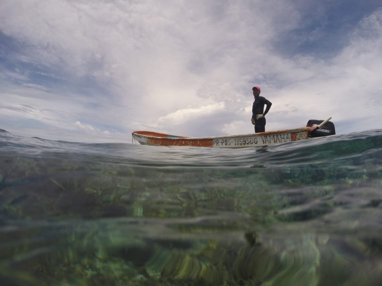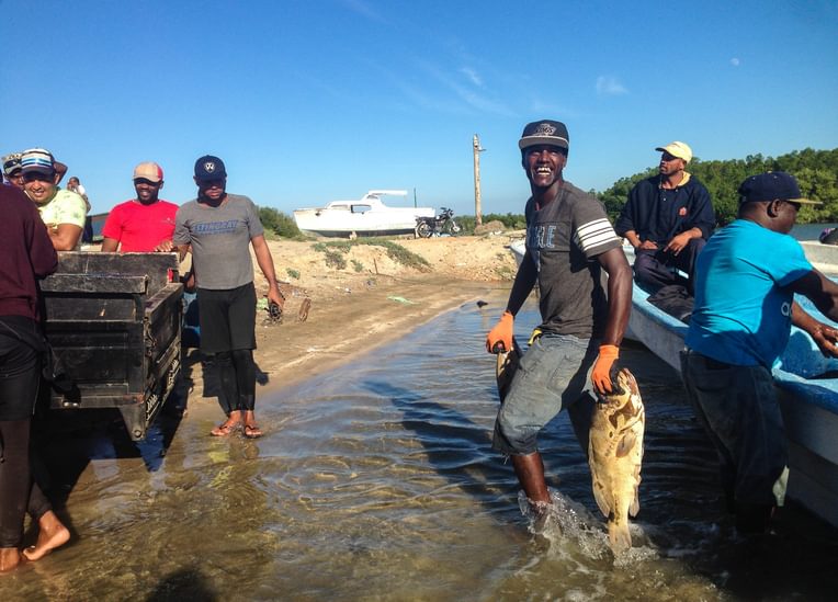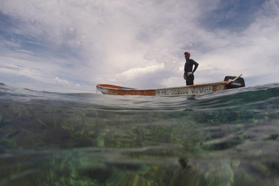 Image 11. North of Dajabón and facing the Atlantic, Monte Cristi depends on small-scale commercial fishing. Skilled divers and spear fishers, residents motor out to banks and reefs offshore, using the color of the water to measure visibility, depth, and location at a glance. Fresh water from the border rivers flows into the ocean, making certain fishing spots opaque and changing the temperature of the currents. Facing harmful river runoff and depleted marine reserves, fishermen increasingly cross the Hispaniola Basin to the north, venturing into Turks and Caicos where the water is always clear and sea life abounds. Fishermen like Luis, pictured here, regularly descend below the surface, moving through an often-overlooked dimension of borders: the subaquatic. Here, he stands watch over his colleagues as they work, making sure each of them safely crosses back to the surface from the depths of the seafloor.