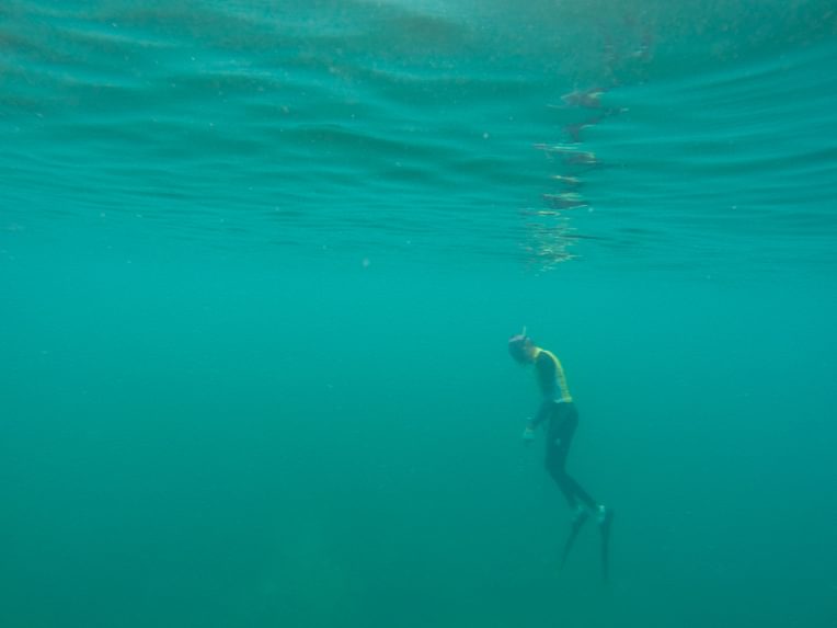 Image 13. The seafloor disappeared underneath a dense veil of dirty green water. Carlos appeared from the depths, floating back up into my field of vision from the invisible rock piling below. The Navy had prohibited fishing vessels from disembarking—ostensibly because of a weather warning, but rumors of smuggling collaborations circulated—forcing diver fishermen to navigate the waters they could swim to from the shore. Today, this water was dirty. I struggled to navigate my own body, spearfishing alongside Carlos, who knew every rock on the seafloor without seeing them. “Once, I killed twenty pounds of grouper right here!” He told me on the other side of the surface as he floated in opaque waters. While the ethnographer’s camera can only see so far into murky water, fishermen use other ways of sensing borderwaters to move through opacity, including hearing, touch, and embodied memory.