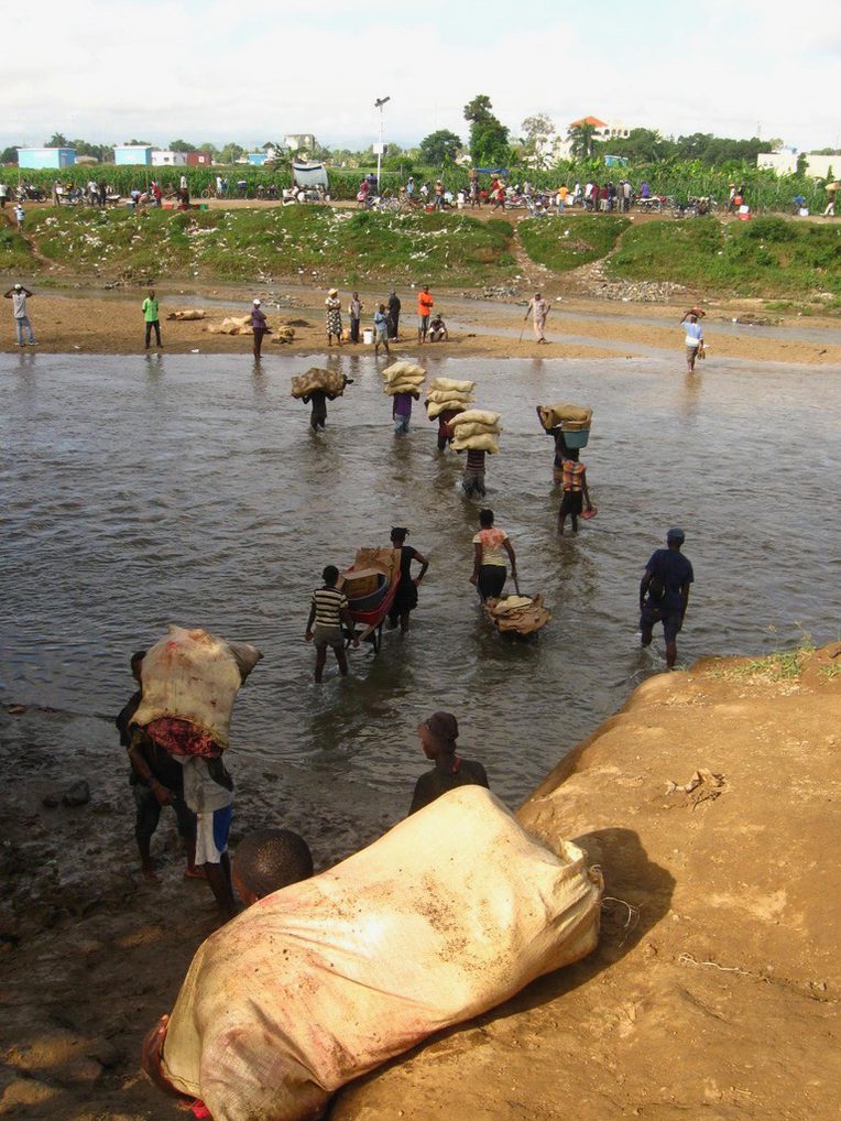 Image 6. At the northernmost border-crossing site, Dajabón and Ouanaminthe, those who cannot afford to cross the official border bridge with passports, visas, or bribes venture a quarter mile north, where Dominican border patrol agents loosely patrol an informal crossing point. Closest to the meat and poultry section of the massive bi-national market, many Haitian vendors buy in bulk on the Dominican side, crossing back to sell smaller portions in Haiti. The bank is steep and often muddy from constant foot traffic on market days. Soldiers, who are rarely long-term residents of the border, vocally hassle the occasional Haitian, more concerned with the opinion of their peers than the permeability of the nation.