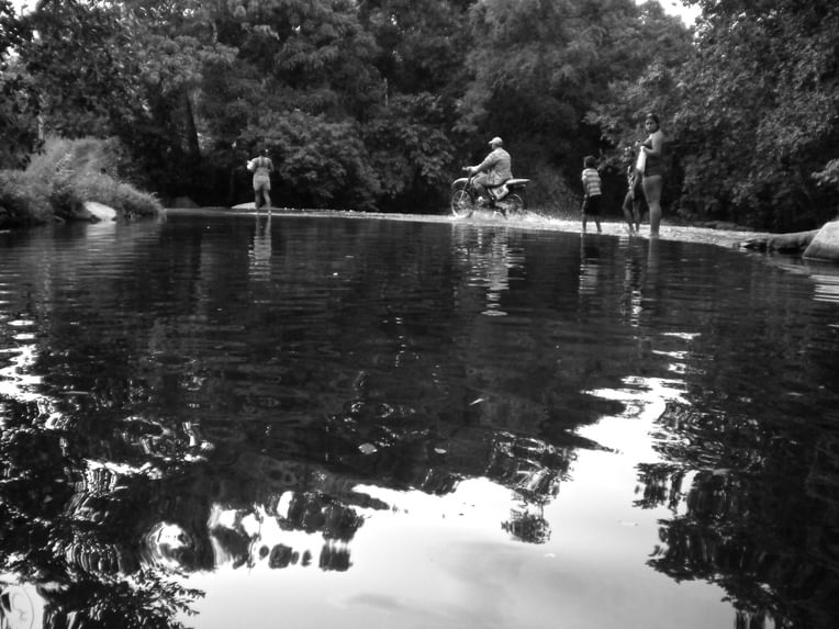 Image 7. Mountain roads dip down into valleys along the international highway, a road constructed sparingly between Haiti and the Dominican Republic in the 1930s. Rivers and streams may or may not flow, depending on the season and the rains at higher altitudes. Women walk across the road, wading ankle-deep in the freshwater, to visit neighbors or the local grocery store. Occasional motorcycles and cars run ripples through the calm pool where the road and river merge. Behind me, a father and son bathe in a deeper part of the pool, diving underwater and holding their breath for as long as possible before breaking the surface in laughter.