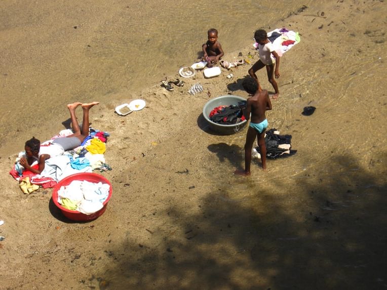 Image 8. Women and children inhabit the shallow Massacre River, washing clothes and eating food purchased at the bi-national market above them. The river’s name commemorates multiple occasions of conflict and bloodshed along the border, the most recollected being the infamous Parsley Massacre of 1937. By dictatorial decry, Haitians living on Dominican territory were targeted and killed by state forces, who could only identify them as Haitian after hearing them pronounce the word perejil, a series of letters that revealed French and Kreyol speakers from their Spanish cohabitants of the border region. Despite such bloody attempts to tear apart the seams of social life in this region, Haitians and Dominicans continue to mix their families, friends, and traditions.