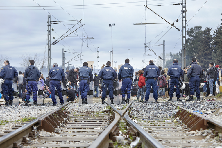 In 2016 when the majority of European governments closed their borders to refugees, the largest makeshift refugee camp Europe has seen since the end of World War II was spontaneously created. The camp was based at Idomeni on the Greek-Macedonian border. It was forcibly evacuated in May 2016 by Greek police. Thousands of Syrians, Afghans, and other refugees of different origins resisted their displacement from Idomeni. They knew that by staying on the border they were highlighting the real international scale of the migration crisis gripping Europe. Here is a protest in front of the railway that connects Greece and North Macedonia. The police officers face the refugees and have their backs turned to the border, one of them can be seen wearing a surgical mask—among the many discourses used against refugees was that of the public health risk.