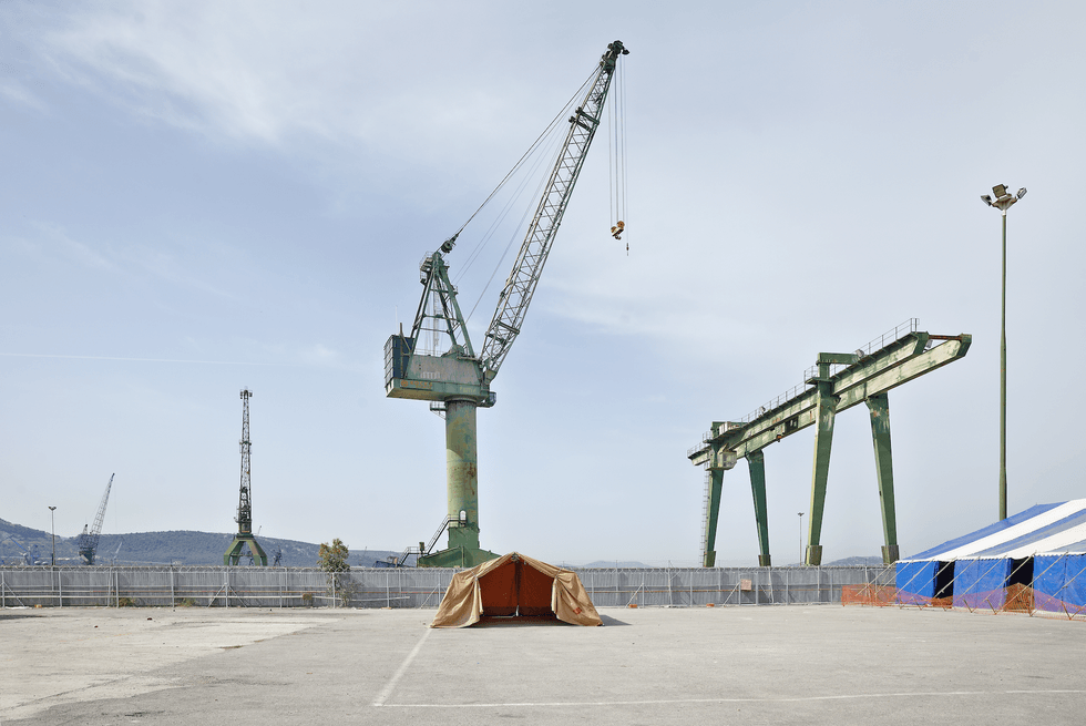 Skaramangas camp, 2016. The refugee camp is separated with a fence from the shipyard, what was once one of the largest shipbuilding facilities in Europe. In 1957 they became a private operation of the maritime businessman Niarchos. In 2002 it was sold to the German HDW and in 2010 was bought by Abu Dhabhi Mar.