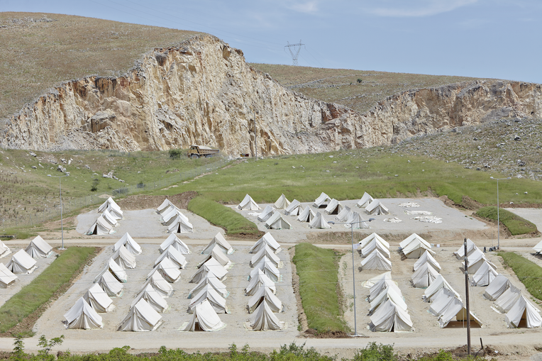 Koutsohero camp, Larisa, Spring 2016. This camp was erected by the army and controlled by the police. The site belongs to the Greek army, yet it is below an active limestone gravel mining facility that thrived during the building boom that lasted between the mid 1990s and mid 2000s. It is still in operation today, filling the air with dust. The camp was also closed down in 2017. In the summer of 2016, the tents were replaced with container houses.