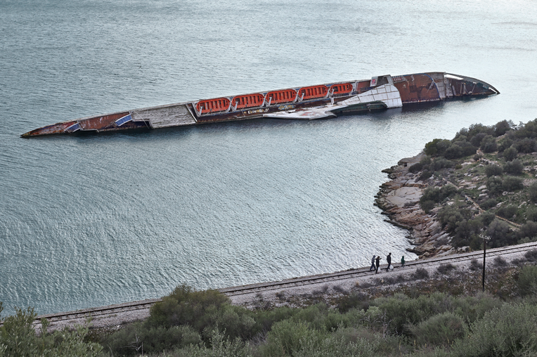 Elefsina. Refugees are walking along the old railway line between Skaramangas refugee camp and the town. In the background is the wreck of the Mediterranean Sky. She was built in Newcastle in the 1950s. In 1971, during the dictatorship, she was bought by a Greek company and operated on the line between Italy and Patra for decades. In the early 1990s the U.S. Army sublet it from the Greek company for operations in Somalia (where some refugees in the camps today are from). In 1996 the Mediterranean Sky did its last trip on the Patra-Italy line before being abandoned by the company, which went bankrupt in 1999. In the 2000s the boat was towed to the Gulf of Elefsina where it sank, following the fate of many boats that belong to one of the wealthier and most powerful groups in Greece, the big maritime corporations (see Malagoniaris 2016).