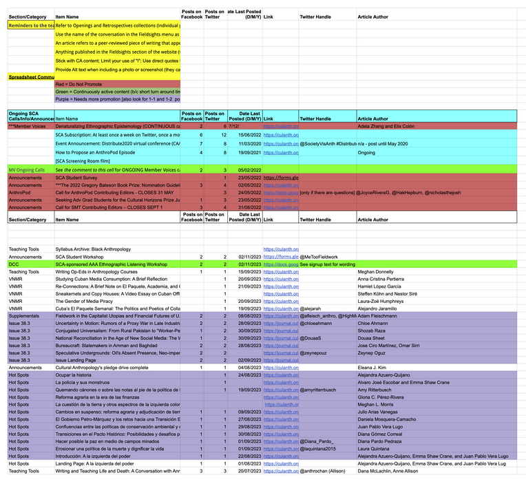 When there are new publications in the journal or Fieldsights, materials are documented in a Google spreadsheet shared and populated by SMT members with archived publications since 2015. To think of this spreadsheet as collective documentation wherein citation is engaged, we turn toward the mechanics of documentation: To be very serious about curation and citation is to make lineages and histories of ideas more apparent or conspicuous. In our work as handlers, we have the task of representing the work of the journal and Fieldsights authors and ensuring there is continuity and rightful representation of the work between website publication and social media. Ensuring that an author is receiving due recognition includes tactics such as correlating their social media handles and creating those links in account posts.