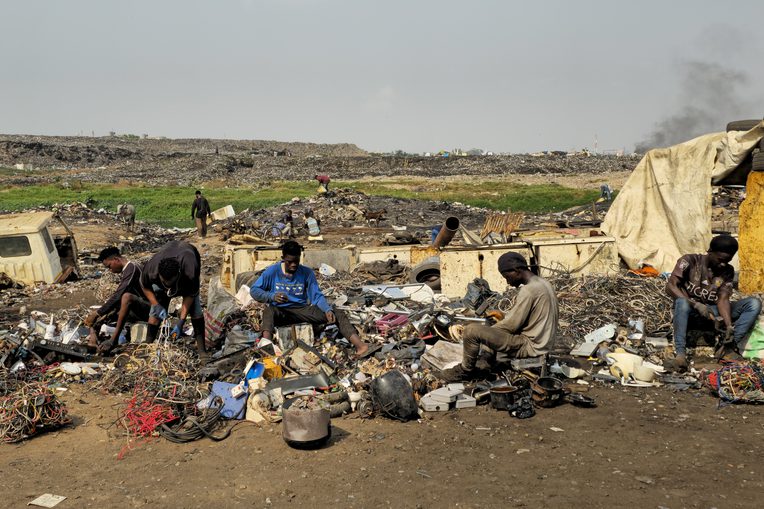 Al poco tiempo viajé a Agbogbloshie (Accra, Ghana), uno de los vertederos de basura electrónica más grandes del mundo, donde cientos de jóvenes desmontan artefactos para extraer el mineral. No se llaman a sí mismos recicladores sino “mineros del cobre”, buscando riqueza en lo que para otros son desechos. Lo hacen quemando cables, respirando los gases, posando sus pies desnudos sobre tierras saturadas de plomo, mercurio, arsénico.