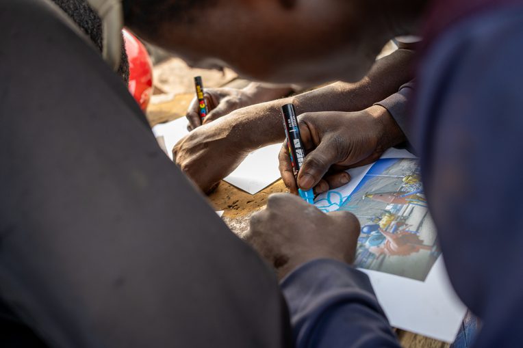 De pie entre piezas de ventiladores, cables cortados y paneles solares descartados, los jóvenes de Agbogbloshie intervinieron las postales con dibujos y palabras. Uno escribió: “Everyone need money but problem is our health”, y rodeó la frase con fibras de cobre. Otro dibujó fuego dentro de un mercado: “Stop the smoking, our lives matter”. Otro escribió una plegaria: “Think about us”. Algunos pegaron restos de plástico o hicieron marcas con el humo negro de sus dedos. Ninguno conocía Antofagasta, pero en sus intervenciones aparecieron elementos comunes: contaminación, precariedad, enfermedad, falta de agua y de dinero. El cuerpo como único recurso y el conjuro como un archivo capaz de mantener a los otros dentro del horizonte de lo visible.