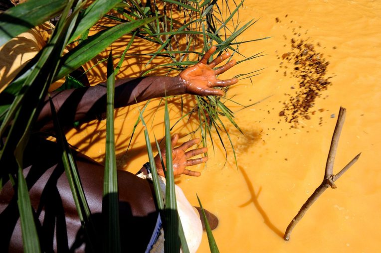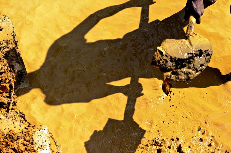 The work is always hot and always hard. As the number of pits grows and the forest canopy disappears the miners place palm fronds around the pit to make shade. In the dry season the bodies of the workers are parched from the waist up, water logged from the waist down, but the work goes quickly. In the long wet season everything is soaked and much of what the miners’ shovels pull out the rainwater immediately puts back in.