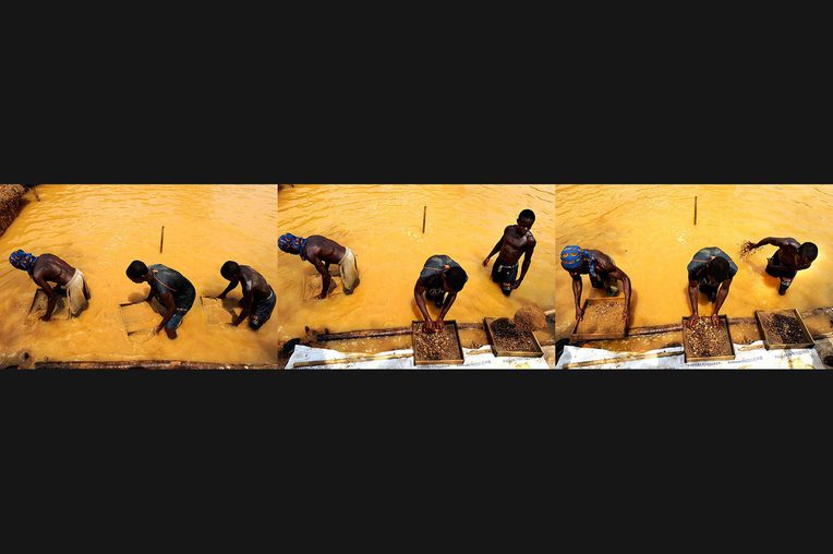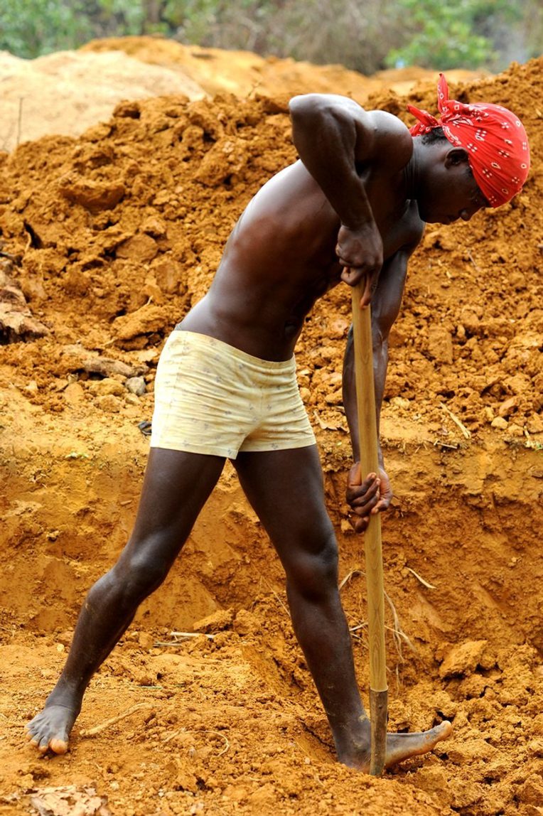Alluvial diamond mining in West Africa is not the productive work of postindustrial skilled tradesmen, the only form of manual labor that most residents of the global North regularly encounter. Artisanal mining is purely destructive and extractive. This is labor normally relegated to other points on the globe or conducted deep underground or it is work done by machines. For most viewers, the image of bodies worked and working in this way is startling. There is an excessiveness to the images that terms like work and labor, when rendered as text on the page, simply cannot register. The work, like the miners who do it, has a militant masculinity about it. Text can chart the larger political economy in which the mines and miners are situated (something the images alone cannot adequately do). But only the momentary alienation sparked by the visual image of this mode of work conveys the materiality of West African diamond mining as labor.