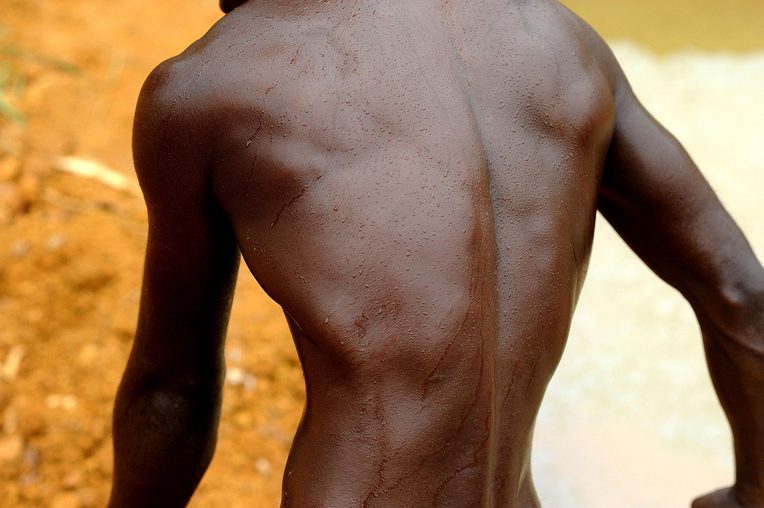 Danny Hoffman’s photo essay, “Corpus: Mining the Border,” presents ten vividly colored photographs of young black male bodies juxtaposed with text describing the paradigms and structures that circumscribe their experiences living and working in border mining towns between Sierra Leone and Liberia. The contents and format of this body of work are immediately fraught with tension. On the one hand, the photographs, beautiful abstractions that, to me, recall the work of Robert Mapplethorpe much more than the modernist documentary photographers that Hoffman cites as his predecessors, represent these bodies as aesthetic entities. On the other hand, the text that accompanies these photographs recalls the mainstream photojournalism that one might find on the websites of the Times and other major newspapers.