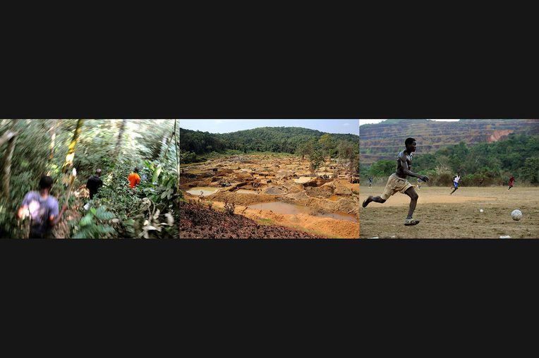 How might the chains of labor in the makeshift camps or social circles that sustain the diamond economy be visualized? Hoffman mentions these things—limiting them, that is, to text—when he might have invited them into a more complicated visual field. The triptych showing men commuting through the forest and playing soccer seems to be a beginning in this direction. What might photographs of the mentioned tents between old houses, or squatters in the ruins of the school or half-built mosque, have added to this essay? Would they detract anything?
