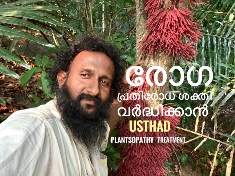As a counterpoint to these controversies, Usthad Hamza Vaidyar (Figure 4) has emerged as the ecumenical alternative. On March 23, he posted a photo on Facebook of himself surrounded by lush plant life. In Malayalam, the photo reads: “Disease: To Improve Immunity Power, Usthad Plantsopathy Treatment.” Holding an honorary doctorate in “Plantsopathy” from Calicut University, Hamza Vaidyar runs the “Sasyabharathi Anti-Cancer Medicinal Plants and Food Research Centre” in Malappuram. Claiming to use 1,424 medicinal plant varieties, Hamza Vaidyar offers low-cost herbal remedies for chronic lifestyle illnesses, especially skin conditions.