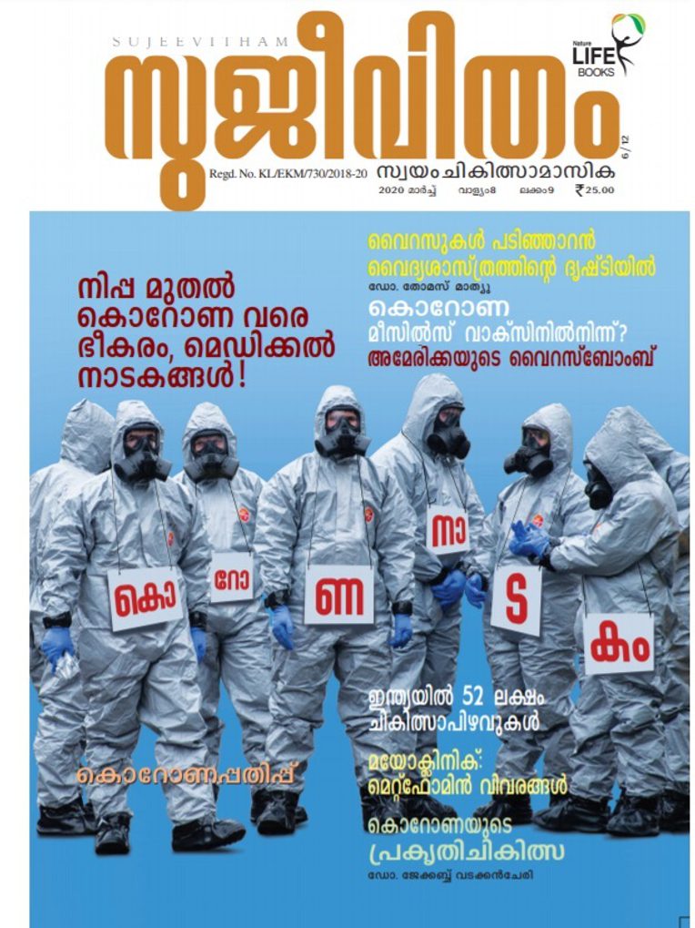 On March 23, 2020, the Chief Minister of Kerala, Pinarayi Vijayan, announced a statewide lockdown, extended to June 30 across all containment zones. In response, Dr. Jacob shifted away from generating governmental suspicion and initiated a hopeful, six-part video series, entitled “Corona: Immunity Tips.” The March 2020 cover of Nature Life International’s monthly magazine, Sujeevitham, also shows how Dr. Jacob oscillates between uncovering the virus’s global origins and celebrating the therapeutic value of local nature (Figure 1). On the left side of the cover, it reads, “From Nipah to Corona there is tragedy, medical dramas!”; and near the bottom-right, “In India, 52 lakhs medical mistakes.” Yet, under that, it hopefully reads: “Nature cure therapies for corona.” For Dr. Jacob, trusting in nature also means maintaining vigilance against global-state forces.