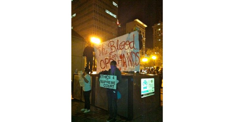 Oliver in Oakland cited a Black Panther party leader who praised anarchists for being willing to take direct action.[13] But, he referred to anarchists as “white kids”, thereby assigning a racial identity to a philosophical tradition, ignoring any heterogeneous identification within the community. “Brother Freeman says people of color run nonprofits, but white kids get stuff done.” Again, there is the equation of the politics of representation with an entrenched leadership, protecting the status quo.