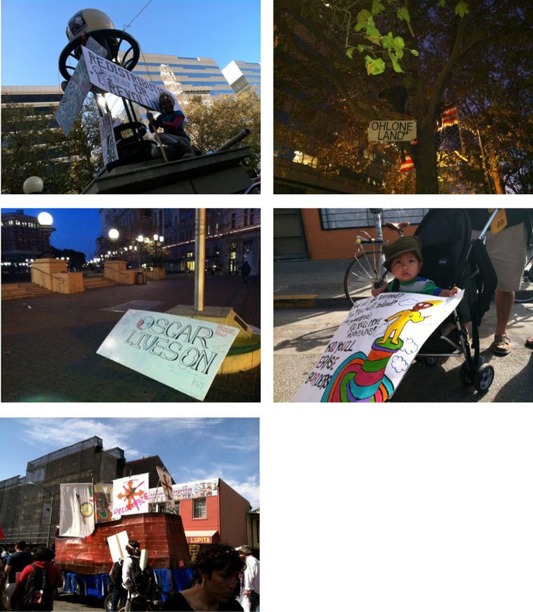 Focus group conversations with youth organizers involved in Occupy in three cities, Oakland, New York, and Atlanta [8], yielded insights about how race is conceived in this movement.[9] In both Oakland and Atlanta, cities with strong traditions of racial justice movements, focus group participants identify their actions as distinct from entrenched nonprofit institutions (often referred to in conversation as the “nonprofit industrial complex”). “Nonprofits led by people of color are pissed that they weren’t asked to join Occupy Oakland,” explained Oliver, a white man in his early 20s, who favored long hair topped by theatrical flourishes, such as a top hat.[10]