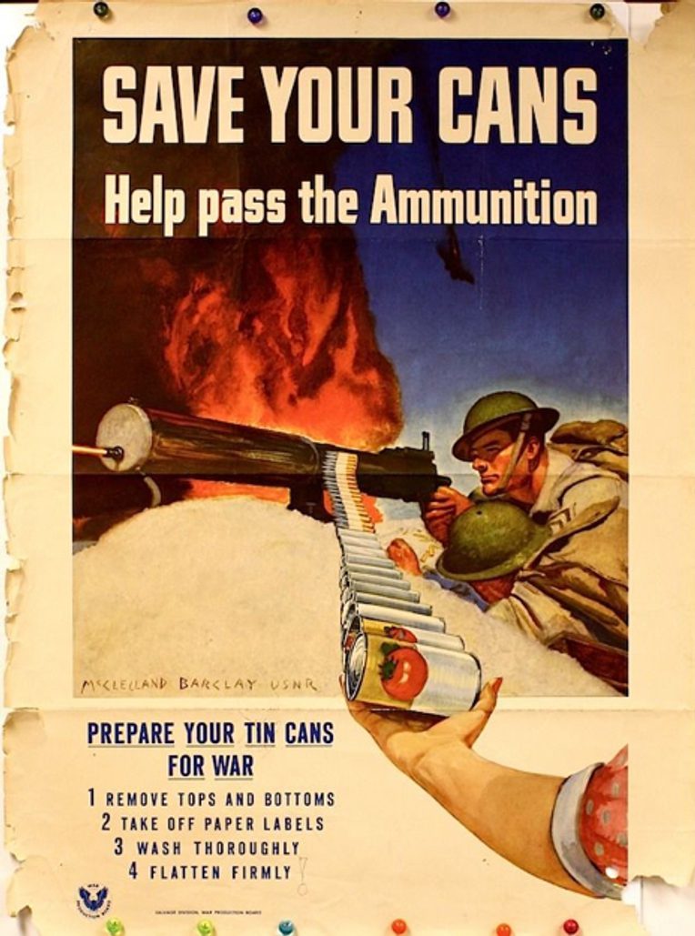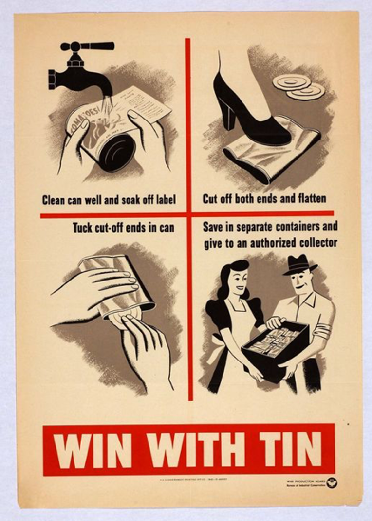 As the rows of Campbell’s soup cans in Andy Warhol’s 1962 painting suggest, tin cans became ubiquitous household objects in the global North, symbolic of a new era of mass production and uniform supply. They also permitted the flourishing of a new kind of domestic imaginary. In this imaginary, food was always ready-to-eat and aprons were rarely dirtied. White women in flowered frocks no longer had to shell peas or shuck corn and could maintain a tidy distance from the dirt of rural work. During World War II, when the supply of tin in the United States was jeopardized by Japan’s seizure of Indonesia and Malaysia—two of the richest sources of tin today—the same frocked women participated in the war effort by learning to recycle their tin cans (Figures 1 and 2). Both a nationally strategic resource and a responsibly recycled soup can, tin crossed various lines of domesticity.