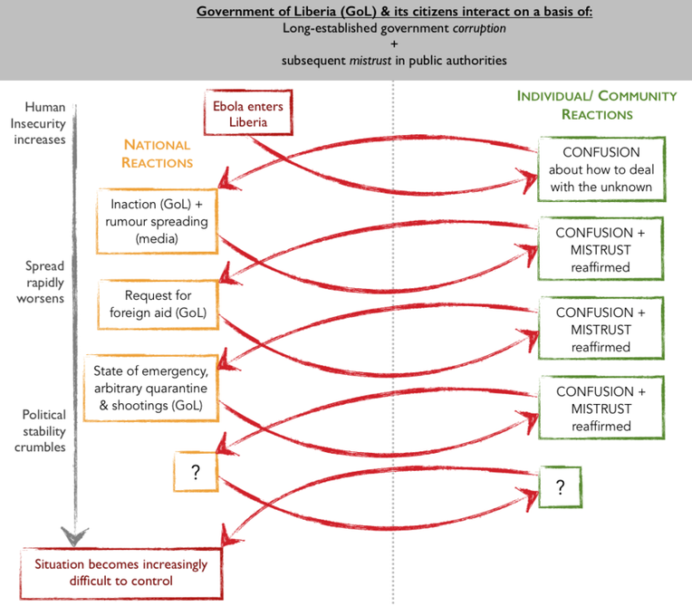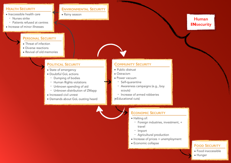 The GoL’s failure to act promptly at the onset of the Ebola outbreak has led to unknowingness, confusion, and reinforcement of historical distrust in public authorities amongst Liberians. The Liberian outbreak and the subsequent collapse of an already weakened system has highlighted the importance of individual’s wellbeing and security. Health insecurity has triggered a worsening on all human security levels.