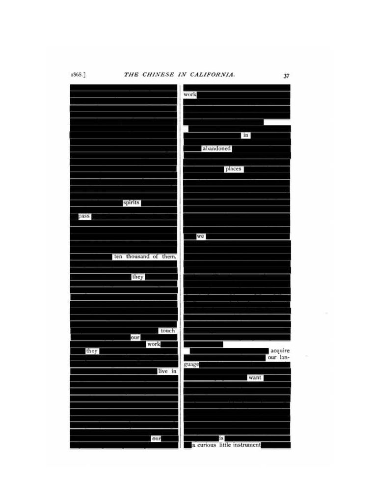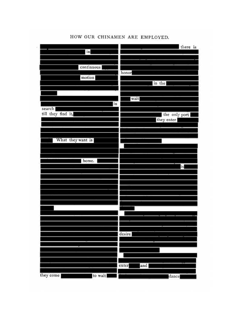 “How Our Chinamen Are Employed” and “The Chinese in California” are erasure poems of nineteenth century magazine articles from the archives of the Chinese Railroad Workers in North America Project at Stanford University. A poetic strategy that involves blacking out, blanking out, or other techniques of excision in order to manipulate found texts, erasure can excavate new grammars and open up new meanings beyond the surface value or original intention of a text. The erasures of these documents give me a way of reading historical records “against the grain,” of subverting these Othering narratives, which were published in the decades preceding the Chinese Exclusion Act. The bodies and labor of people who were subject/ed to the scrutiny of these types of editorial analysis provided Stanford its extractive wealth for the university’s founding.