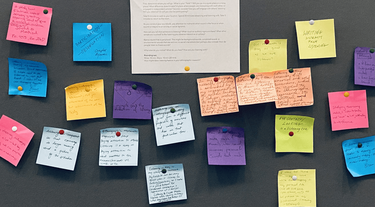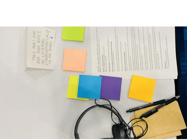 For the final portion of the workshop, we sent participants out into the convention center to turn their ethnographic attention toward how other people listen. We envisioned learning about how someone giving a conference paper is listened to by the rest of the people in the room, but instead learned about how relations are made in hallways, birds noisily cohabiting in an outdoor patio, and infrastructural hums and whirrs largely ignored by people. We concluded the workshop by asking participants to write a response to the prompt: “How might/does listening feature in your ethnographic research?” We hung the sticky notes with responses on the wall as part of the exhibit.