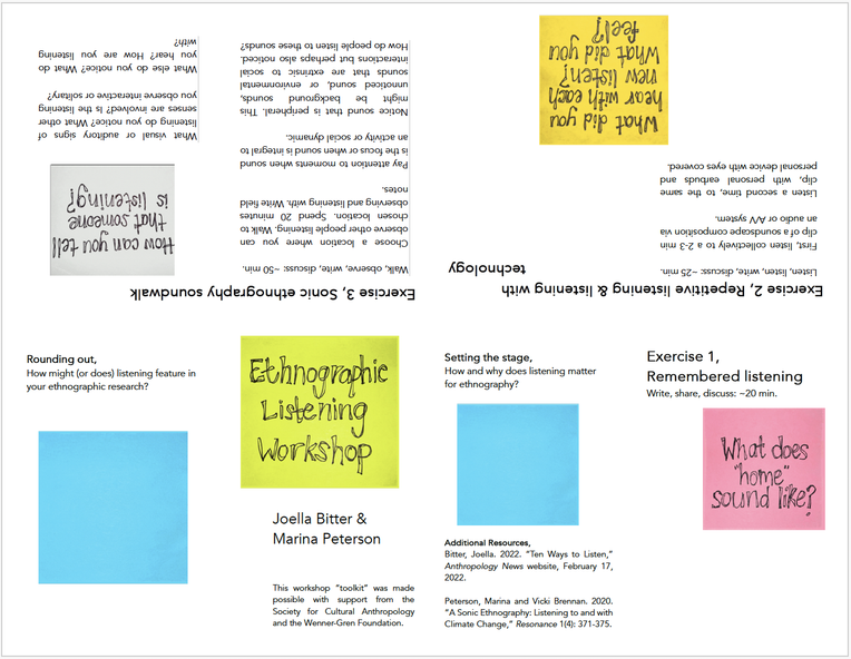 The three part workshop engaged with sonic memory, recorded sound, and ethnographic listening. These afforded an exploration of sound as remembered, heard with and through audio technologies, and significant in orienting people toward one another and a more-than-human world. Listening prompts were developed collaboratively, from Joella and Marina’s respective experience leading public listening workshops and teaching classes on topics related to sound in anthropology. The prompts treated sound expansively while emphasizing methodological tools that might be deployed in a variety of settings. Intrinsically reflexive, the prompts invited participants to focus on listening as a way of treating sound as emergent, processual, and relational.