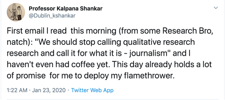Qualitative research paradigms are often set in contrast to quantitative paradigms. And, in a lower-division anthropology class, students may only have familiarity with approaches to science and research that privilege a positivist, quantificational approach. Ethnography, as a research approach, encompasses a suite of research methods, frequently employing both quantitative and qualitative data collection and analysis. Yet beliefs such as the one shown in the tweet above demonstrate that “qualitative” research is sometimes cynically viewed as a puffed-up way of saying “journalism.” These attitudes malign and mischaracterize both journalism and qualitative research paradigms, like ethnography.