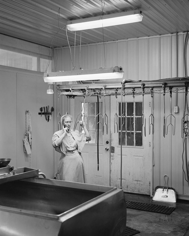 Image 1. In Image 1, we have one member of a family that may be the most progressive and creative farmers in Kansas who raises pasture-based chickens and ducks, sheep, beef, and non-GMO row crops; runs the state’s first GMO-free chicken feed company, a butchery; and created a new line of pet foods while leveraging new financial systems like Slow Money (see Field 2014). But we are also confronted with contradictions. The style of dress indicates certain strictures of religious adherence, yet she is holding onto state-of-the-art, on-farm chicken processing equipment while working via mobile phone. The processing plant itself indicates a challenge to the sentimentalization of smaller-scale agricultural practices in the United States. The family did not start farming until the father and mother were in their forties. Now three generations and a handful of full-time employees contribute to the growth and emergence of a diverse farm and food operation without marketing via the internet.