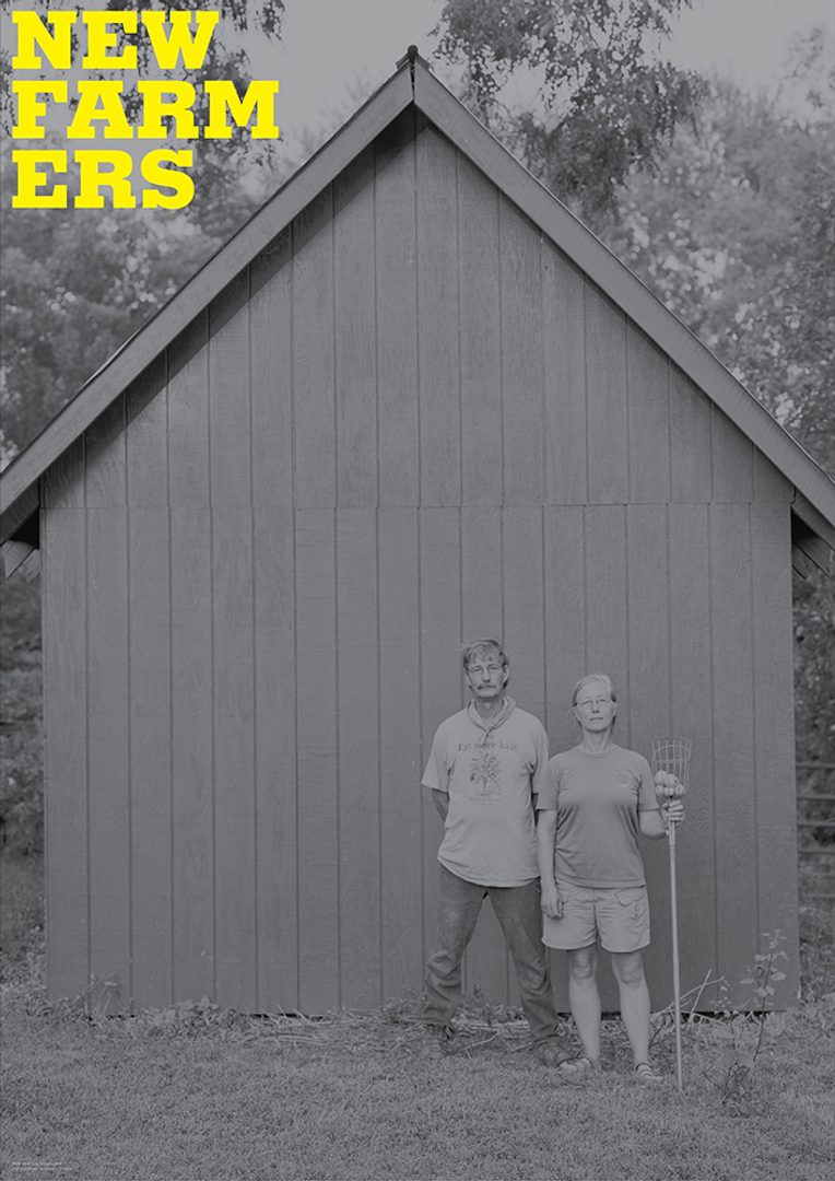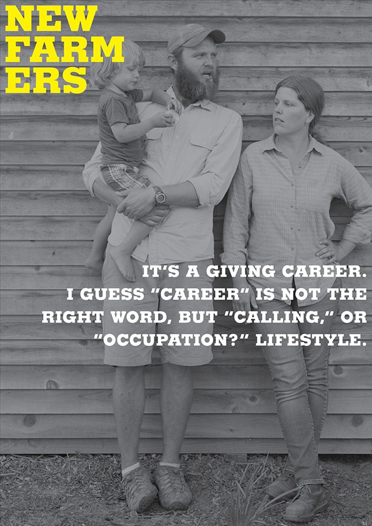 (1930), indicating a playful sense of the rural vernacular in the United States.9 This slowness in the making of each image also mirrors the “slowness” of working across disciplines, languages, and formats. By approaching the research from the standpoint of “‘with’ rather than [solely] ‘about’” (Mannay 2015, 21) these aesthetic choices (black and white especially), like the farmers’ choices, aim for a respect of the past and tradition. The portraiture also represented a departure for the photographer used to landscapes and places; while for the sociologist trying to imagine the work in the form of a newspaper or posters rather than a narrative story took trust and openness. For branding the project the designer specifically chose typefaces that were connected with that time period but wanted to use them in a modern way. Here the New Farmers “logo” offers a consistent element throughout the various and unconventional iterations of the project. The design is contemporary, but rooted in the things that have been done before (see Suchman 2018).