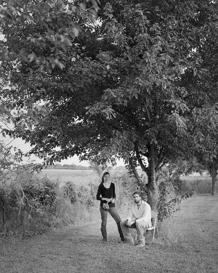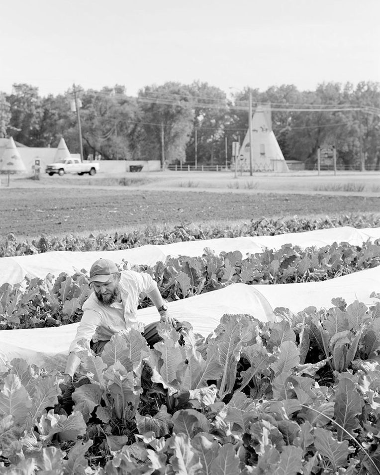 The addition of a graphic designer helped the photographer and sociologist push past their disciplinary-specific limitations (prints or journal articles, for example) toward “aesthetically pleasing artifacts” (Boradkar 2011, 150) with an intent to challenge typical understandings of farmers in the contemporary world. We—and our farmers (see, especially, Images 1 and 10)—are working in conventional territory (agriculture, photography, exhibitions), but in more unconventional ways (small-scale, first-generation farming; view-camera photography in the 2010s; interdisciplinary ethnography). A designer brings a consistent visual language that mediates and rearranges the words of the farmers to enhance their story that unfolds in the photographs (see Images 2, 4, and 10). Design in the New Farmers project highlights the harmony between the interviews and the images of these farmers in their places. For example, a designer often gives art direction when working with a photographer—“Make it look this way.” Alternatively, this project is an equal collaboration with one another. Working together in the field (through conversations and travel including shared meals) undoubtedly affects the look and content of the photographs (see Image 2). Where the Farm Security Administration (FSA) projects during the 1930s and 40s documented despair and exodus (often to nowhere fulfilling), New Farmers documents farmers, families, and those working in cooperation building their lives in hope in Kansas. That place, Kansas, then, features prominently in the photography in the landscape, the fields, the prairie, and their homes.