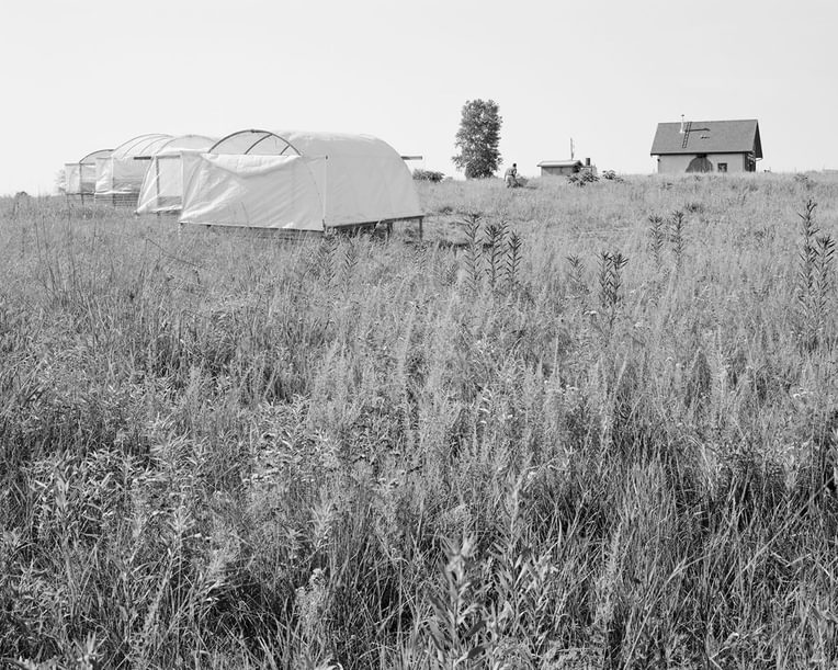Image 9. In the foreground the farmer grows native prairie grass including big bluestem and other flora. The four mobile chicken houses house upwards of two dozen egg-laying hens to supply a farmers’ market stand and two local grocers including one of the larger retailers in the regions. In the background is the straw bale house built by this farmer and friends. The location of this home and farm have been shaped by housing policies in the county where he sells the eggs because straw bale houses are not allowed. So this farm is in the neighboring county with less restrictive housing policies. Again these new farmers aim to bring values in line with their choices and practices of everyday life that offer examples of what could change.
