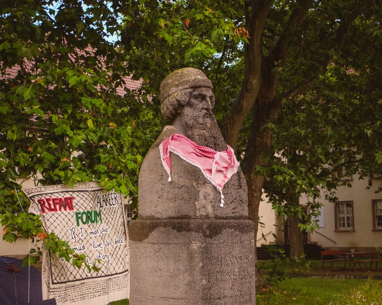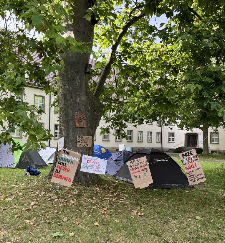 In mid-May we announced on Instagram, as the newly-founded Students for Palestine (SfP), that we stood “in solidarity with the Palestinian civilians who are suffering from the extreme violence of the Israeli military as well as the silence of ‘the West’ in this regard” and called on like-minded students. Inspired by other pro-Palestinian encampments in Germany and beyond, we demanded of our university—a public university with about 30,000 students in a mid-sized German city—to disclose and cut ties with arms producers and Israeli institutions complicit in physical and epistemic violence, and to openly condemn arms deliveries and the genocide in Gaza. Because we were aware that student protesters elsewhere had been accused of being anti-Jewish hate stirrers and Hamas supporters, we wanted to avoid any potential grounds for such accusations and stood from the get-go in close dialogue with our university’s security department. After two rallies on campus as well as an information stall and poster campaign at our university’s Open Day in June without any response from the university to our demands, we decided to redirect our activism into holding an encampment from July 3–6, 2024.