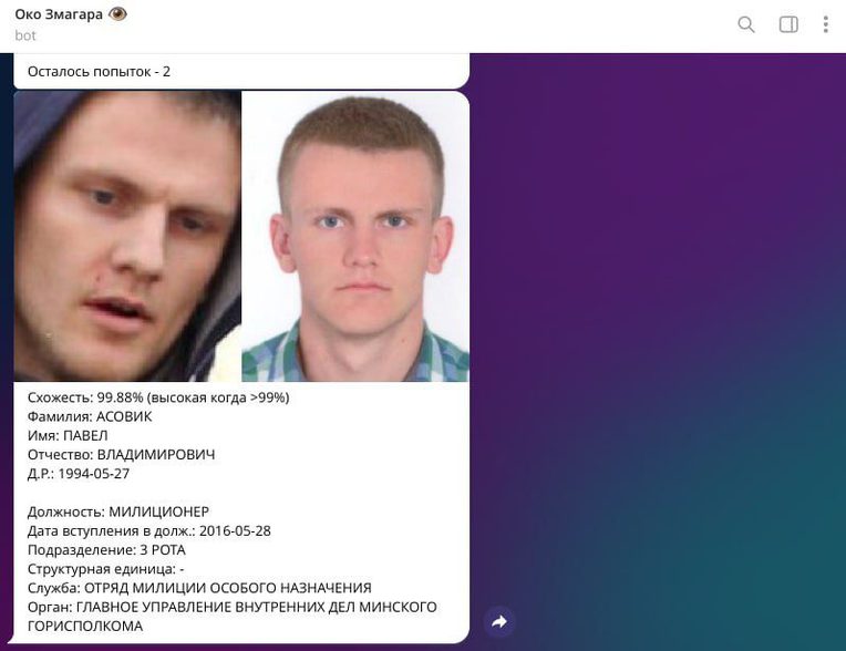 In April 2023, Cyber-Partisans—a Belarusian hacktivist group—released a face-recognition bot that drew on photographs crowdsourced through Telegram (see fig. 2). The software generated a similarity score between the database and users’ photo submissions and deemed a match reliable when the similarity score was ninety-nine percent or higher. Activists claim that this software was made possible through the aggregated materials collected through the Black Book of Belarus and the Punishers of Belarus Telegram channels.