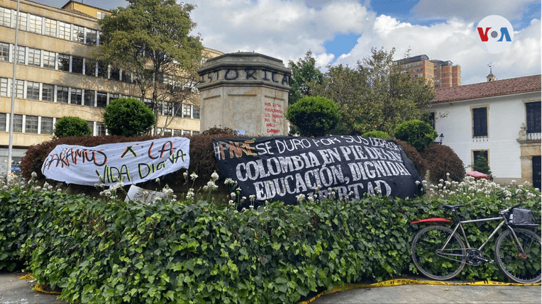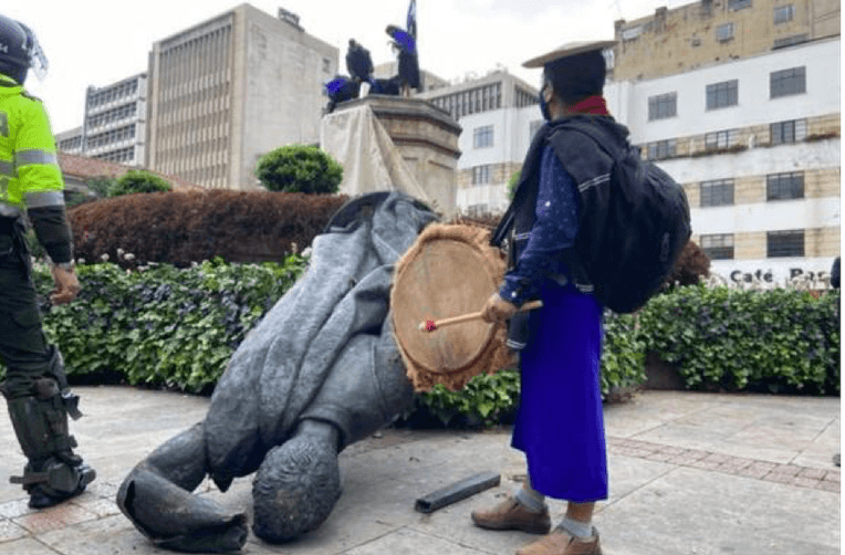 En el marco de las movilizaciones en Bogotá que empezaron el 28 de abril, la estatua patrimonial del colonizador español Gonzalo Jiménez de Quesada fue derribada por acción de indígenas de la comunidad Mizak. Eventos como este, no son nuevos en el contexto nacional, otros dos monumentos fueron intervenidos en Colombia recientemente, todos referentes a figuras masculinas de la conquista española. La communidad Misak, del suroccidente de Colombia tienen un tradicion de actos revindicativos en las tierras usurpadas de ellos durante el periodo colonial. Una de las mas visibles intervenciones fue le destrucion en el 2020 de la estatua del conquistador Sebastian de Belalcázar en la cuidad de Popayán.