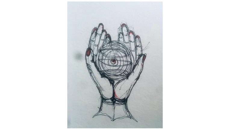 I am transfixed with Nkurunziza’s bespoke sketch. Zooming in and out and then gliding over specific sections of the sketch, such as the tips of the fingers, wrists, and palms where the use of black and red ink is more pronounced, I imagine Nkurunziza working away in the depths of the night with his cat, Korona, by his side, in his studio Inema Arts Center, an institution he co-founded with his brother Emmanuel Nkuranga. My gaze then rests on the sphere-like object that sits delicately between the pair of hands, an object that suggests a certain cosmic energy. Its core, marked with a red dot at the end (or beginning?) of the spiral, is absorbing and radiating energy from the hands. The sketch stimulates a sense that hands are responsible for producing, mediating, and protecting the energy of the spinning sphere. Nkurunziza’s hands are his creative tools. They connect him to the cosmos, allowing him to travel through space and time according to his own pace. Hands are spellbindingly powerful. In Nkurunziza’s precise words, they “hold all life.”