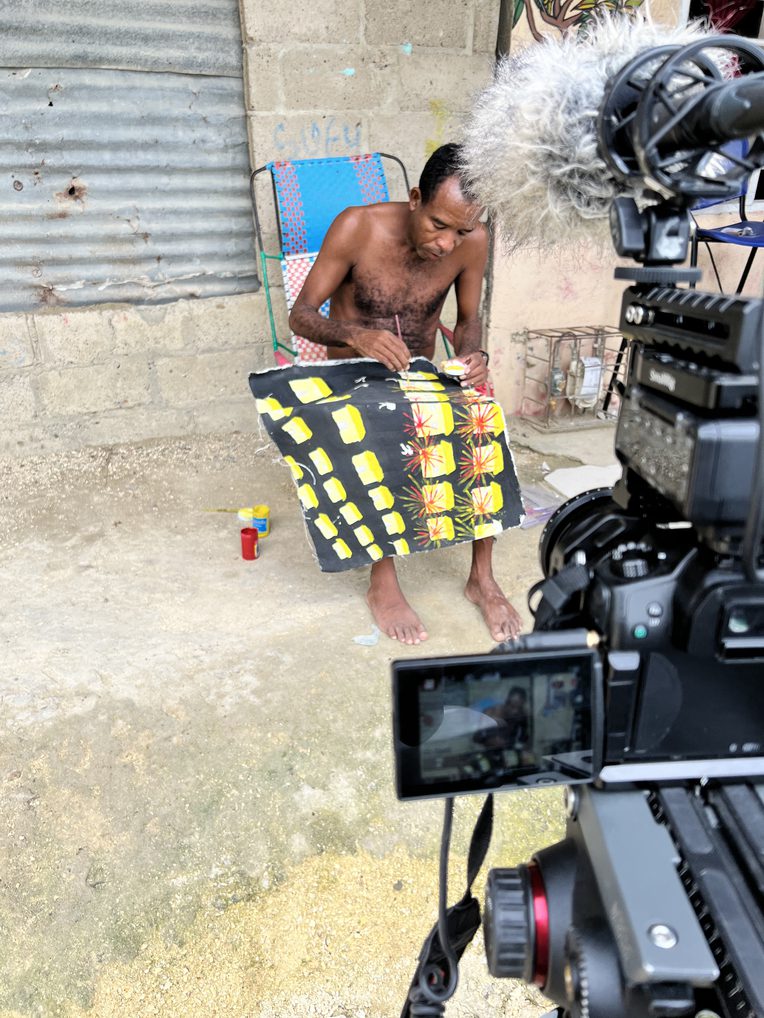 The filmmaker explains that his research for a biography commissioned by Colombia’s Ministry of Culture led him to develop A Future Buried in the Past. Echeverry met César Villa while investigating the life of a 96-year-old musician in Sincerín. The artist's paintings first captured Bustos-Echeverry’s attention, which developed into a lasting friendship and joint project. According to César, Bustos-Echeverry was the first to find value in his artistic practice. The camera captured his presence, evoking a sense of pride in him.