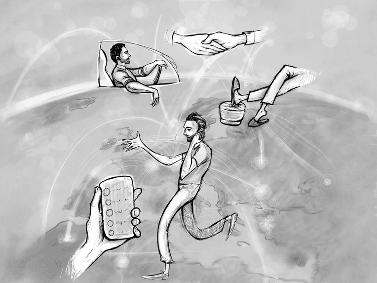 This post is, in some sense, an experiment with digital illustration as a means of visualizing ethnographic situations while preserving participants’ right to anonymity. It tests out the hypothesis that illustration can provide the kind of circumspection that ethnographic writers achieve through pseudonyms and ethnographic composites. It was a pleasure to try to depict the metaphor of “human routers” and to incorporate some details of your ethnographic description: the slippers worn by Farhan in his empty office, the small cups of Arabic coffee prepared by Um Faisal, the key role of the cell phone in brokers’ interactions…