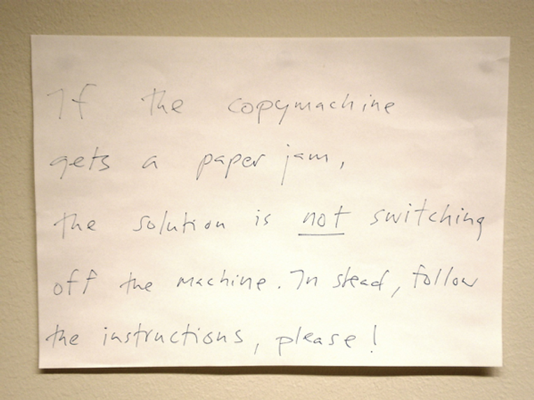 A landline telephone is not a smart artifact like the copy machine featured in Lucy Suchman’s (2007) classic study of human interaction with an interface. A copier’s ability to be sensitive to context and to provide users with contextual help is illustrative of the fact that the smarter the technology, or, better, the smarter the smart technology’s interface, the more communicative interaction—and less direct control—is involved in human operation with this more humane technology that uses textual messages to address users. This doesn’t necessarily make it easier to operate the artifact or involve less social interaction concerning the ways of using, even though it lessens the burden imposed on users concerning knowledge users need to have in their heads. In the image below, we see communication between users about communication between the machine and the users.