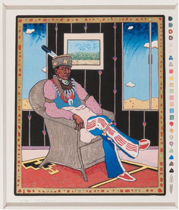 In the desert spaces between quintessence and stereotype grows a flower called authenticity. It is rare. One form of being is encased within other forms. Frames within frames take us from Southwestern mesas outside the window to Van Gogh’s Wheat Fields—another space-time hung from the wall of home. A Pawnee Chief’s feet rest on Navajo weavings. A photograph taken with all the hyperbolic seriousness of Edward Curtis is reclaimed as a Japanese-style woodprint, forged while the artist was in residence at Dartmouth: Vox Clamentis in Deserto.1 The subject of objectification in this settler colonial hall of mirrors becomes a character who accumulates, maybe even treasures. Someone asks: Is this meant to be ironic? The living is in the multitudes.