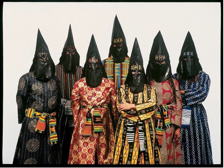 This one throws them. In our virtual classroom, you could hear a pin drop. Nothing is easy about the image. There is talk of trigger warnings in this summer of reckoning. Memory runs thick like mud. Wait. Look deeper. Begin with what you witness, not with what you think you know. Seven figures. Black pointed hoods. Robes fashioned from kente cloth. Three letters: HHH. Hands and eyes that present across a skin spectrum. Saturated in overdetermined iconography, they do not expect a female Australian Aboriginal artist. They do not expect Hedonistic Honkey Haters, a group formed in 1965, in opposition to those other three letters, those other hoods.