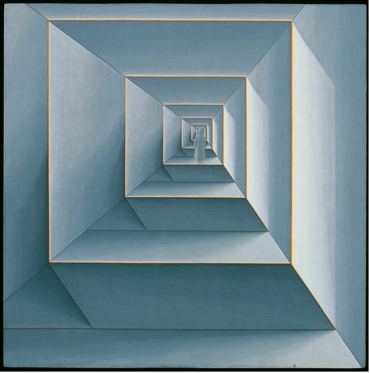 At the outset, they speak of symmetry, geometry, and proportion. Then they describe a palate of emotion—cool, melancholy, sterile—as a metaphor for the colors of mourning. Form becomes content. Some assume asylum. Others think hospital. I ask them to consider the difference between these institutions. Curiosity piques. Who is the person at the center of this American yantra, this mandala of loss? Is she facing toward us or away? Is she wearing a housecoat or a surgical gown? Why does this matter? I tell them about the Ascent of Souls, the artist’s mother. We contemplate the infinity of death, infinite depth.