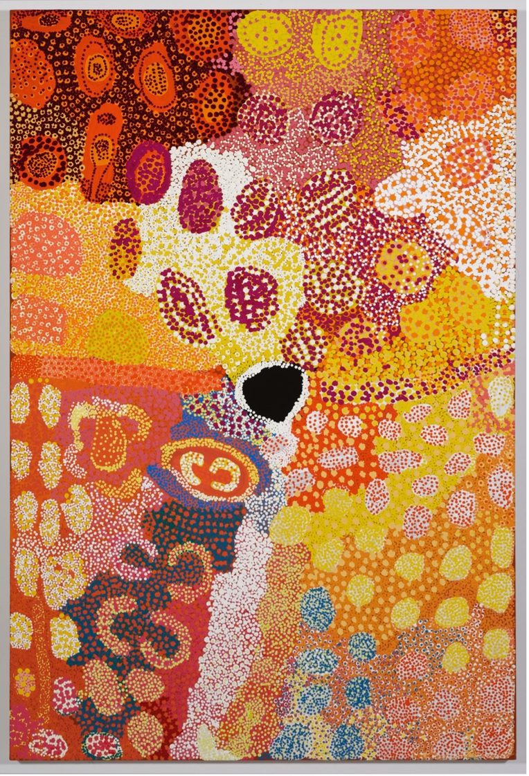 At first, the focus is on color, pattern, beauty. It shimmers. They toss out words like “tapestry,” “contemporary.” A student with studio art experience speaks of stippling. Someone else riffs on Jackson Pollock. I provide some context for this Dreaming. Abstraction comes into focus. Materiality lives in the abstract, each dot a story. This is her grandmother’s country, a place of good water, where women’s knowing runs all the way through. Once, these female ancestors made fire at water’s edge. They danced, then walked west, collecting flowers of the murlanpa (sugar tree). There is nothing abstract about it. Kinship lives on and beyond canvas.